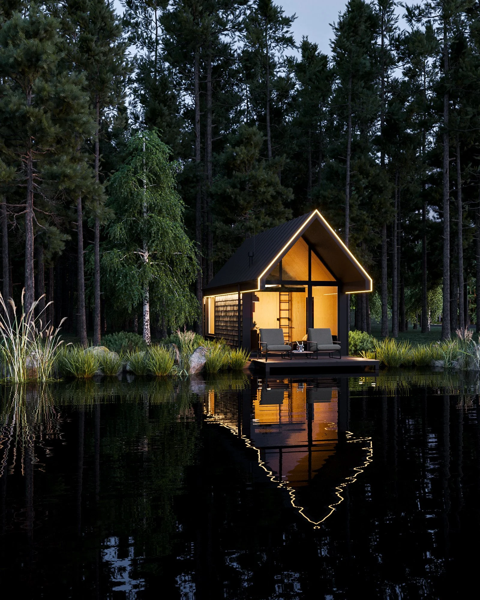 Каркасний котедж площею 31 м² із двома спальнями, санвузлом, компактною вітальнею та терасою. Планування передбачає шість спальних місць і максимальне використання простору для зручності відпочинку.