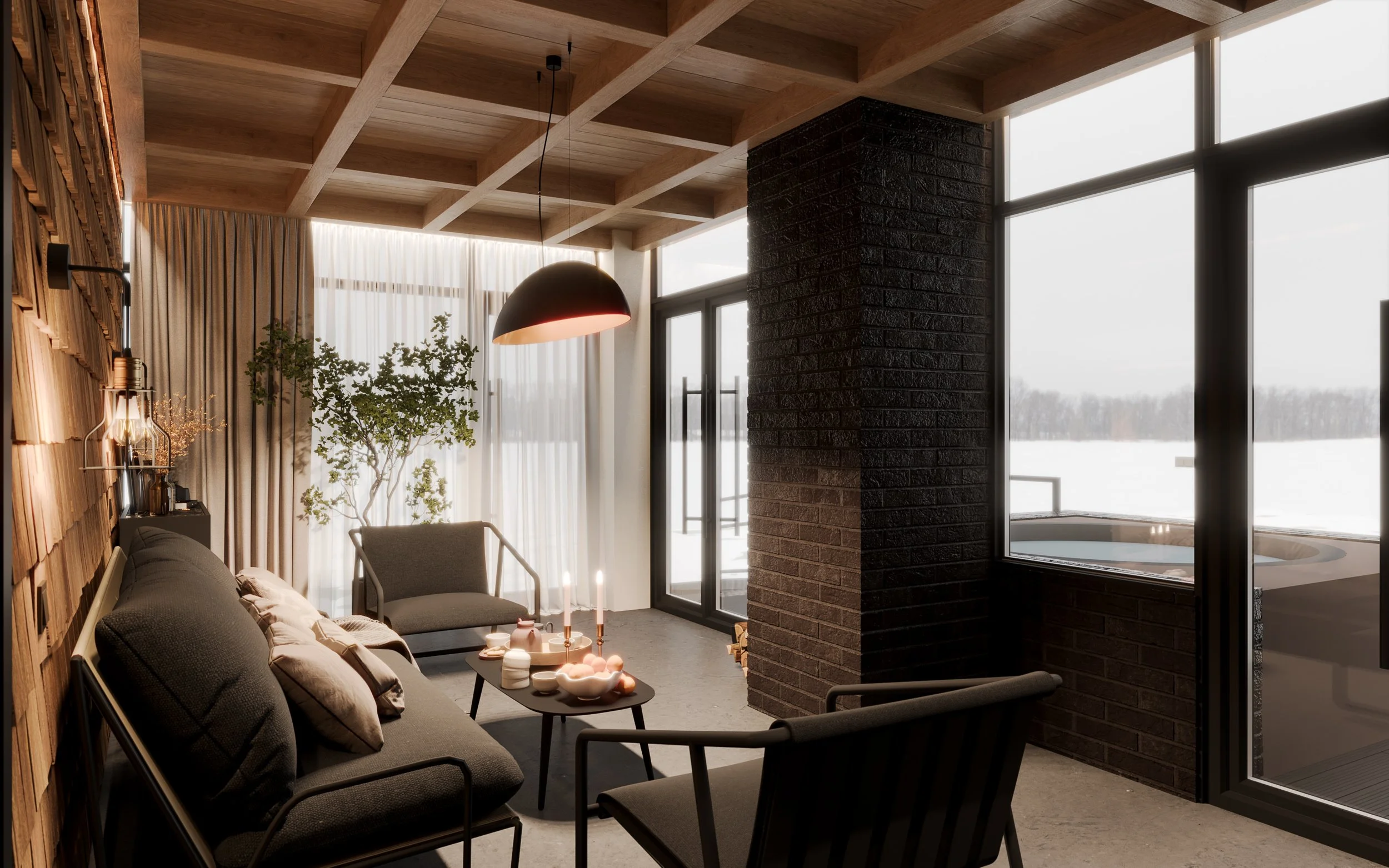 Чан із панорамним видом на озеро, виконаний із використанням натуральних матеріалів. Дерев’яна конструкція та гонт підкреслюють зв’язок із природою та створюють автентичну атмосферу відпочинку.