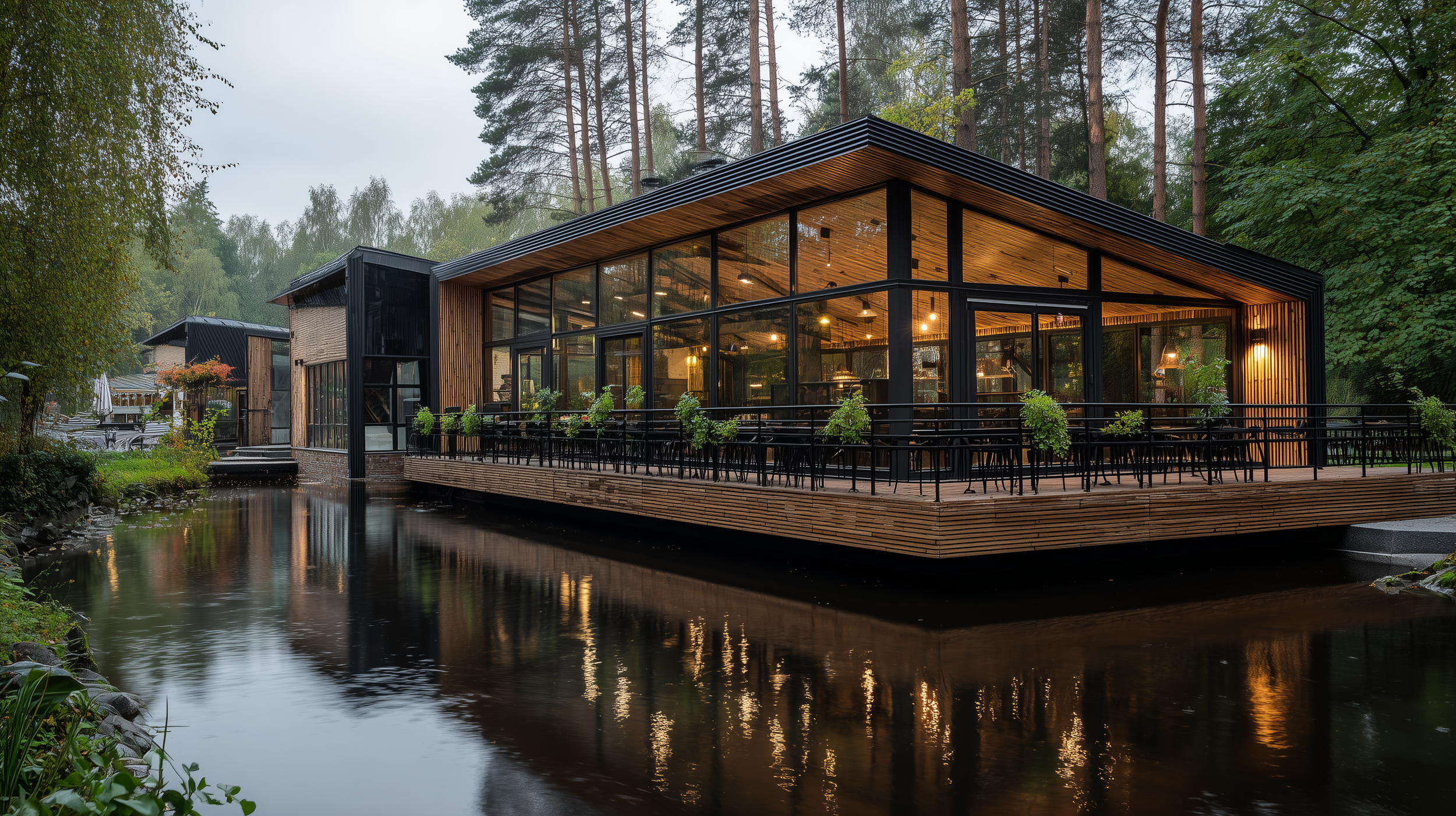 Наш ресторан ми створили в стилі barnhouse — просту й чесну архітектуру, яка поєднується з лісом і водою. Тут панорамні вікна відкривають простір у природу, а тераса на воді додає легкості й особливого відчуття гармонії. Усередині — стриманий мінімалізм, болотний відтінок дерева, камінь і м’яке світло, які формують атмосферу затишку та елегантності.