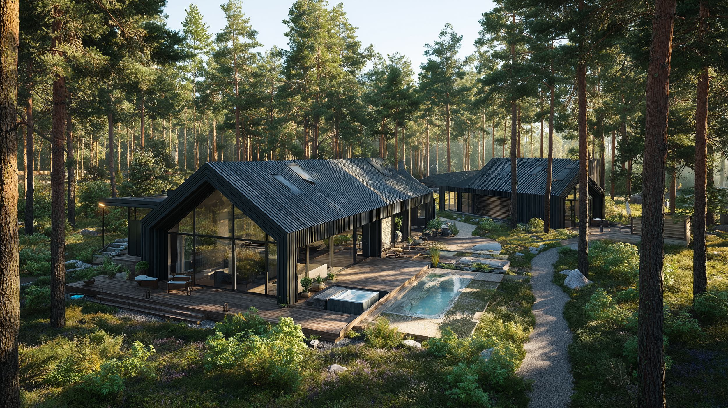 Сучасний простір відпочинку у стилі barnhouse, створений серед соснового лісу. Виконаний з натуральних матеріалів у глибоких болотних відтінках дерева, з панорамними вікнами та терасами, що відкривають простір у природу. У комплексі передбачені басейн, сауни, зони релаксу та відкриті SPA-зони.